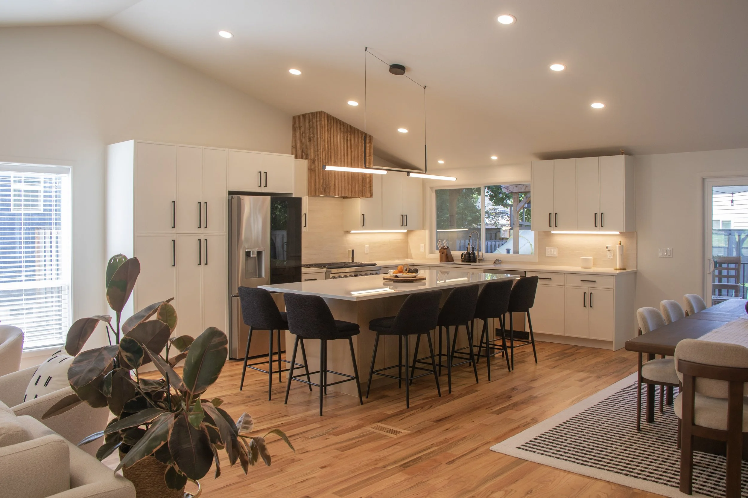 We recently completed a full open-concept kitchen and dining remodel in NW Portland, transforming a closed-off, compartmentalized layout into a bright, functional space designed for modern living. By removing multiple interior walls and installing a structural glulam beam, we were able to fully open the kitchen and dining area while maintaining a flat ceiling plane and long-term structural integrity.